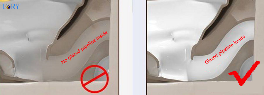 Due to the glaze applied to the inner wall of the sewage pipe, it cannot be visually distinguished. When choosing, you can reach into the sewage pipe and touch the inner wall to see if it is smooth. If conditions permit, merchants can display a cross-sectional view of the toilet to see if the deepest part of the sewage pipeline is glazed.